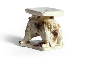 The figure is modelled in the form of a powerful lion standing on a base supporting a rectangular upper surface. The beast is depicted with a fierce expression and is covered overall with a transparent creamy glaze splashed in russet brown. The base and underside of the top are unglazed showing the greyish-white stoneware body
