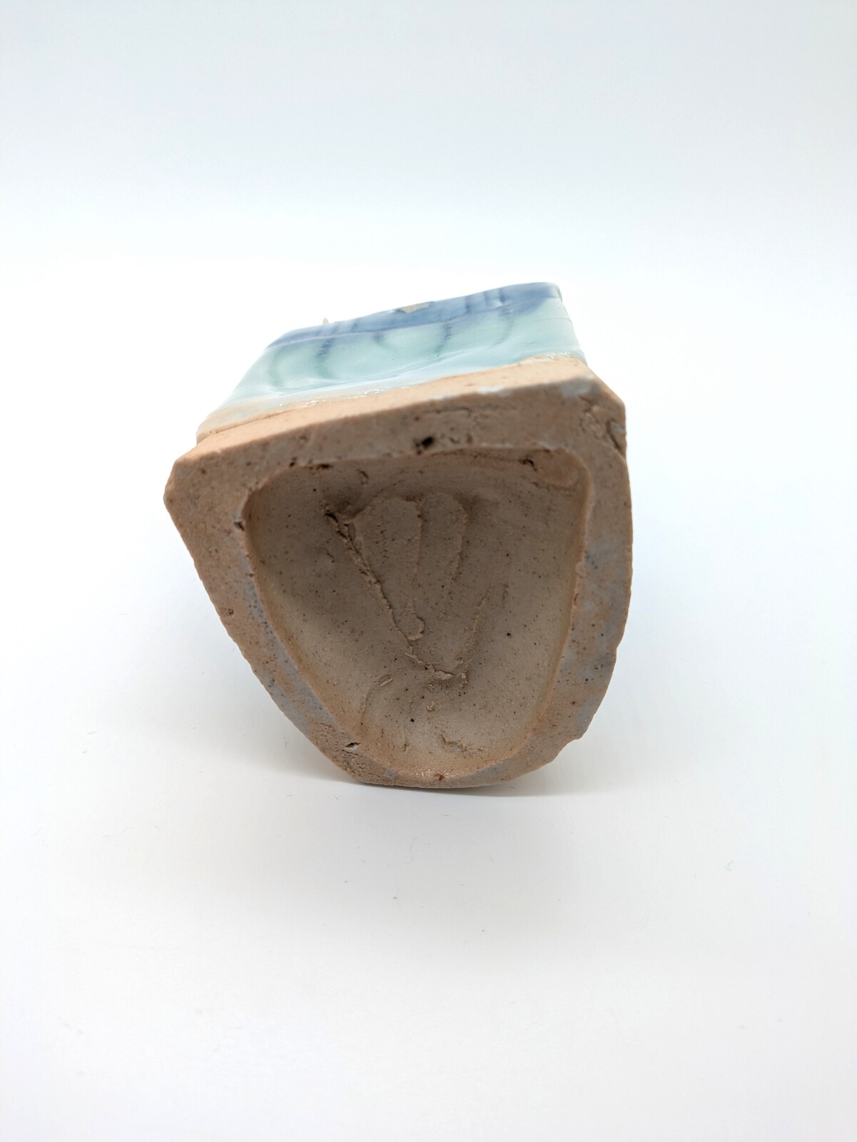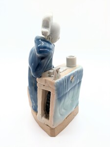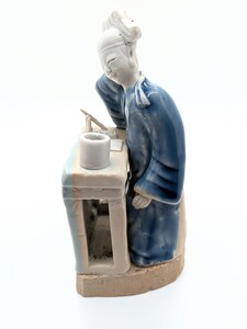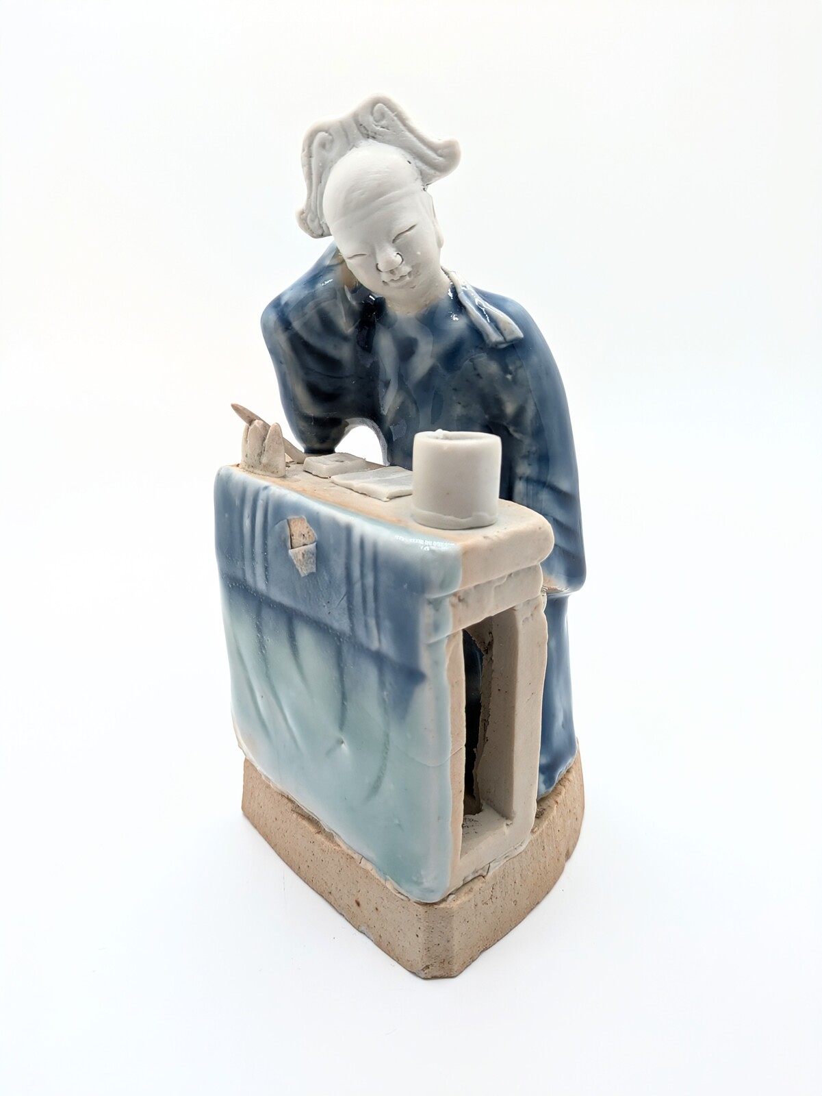 特徵:此像塑一穿著藍袍的書生坐於書桌前,右手托腮,歛眸微笑,狀似凝思。桌面上放置著無釉的筆筒、紙硯、毛筆與筆架。書桌前方懸掛的布幔施青釉,桌面、側邊與底座均未施釉。著名收藏家墨一閑所著《筆筒淵鑒:收藏家的隨心所悟》書中著錄一件極為相似的作品。