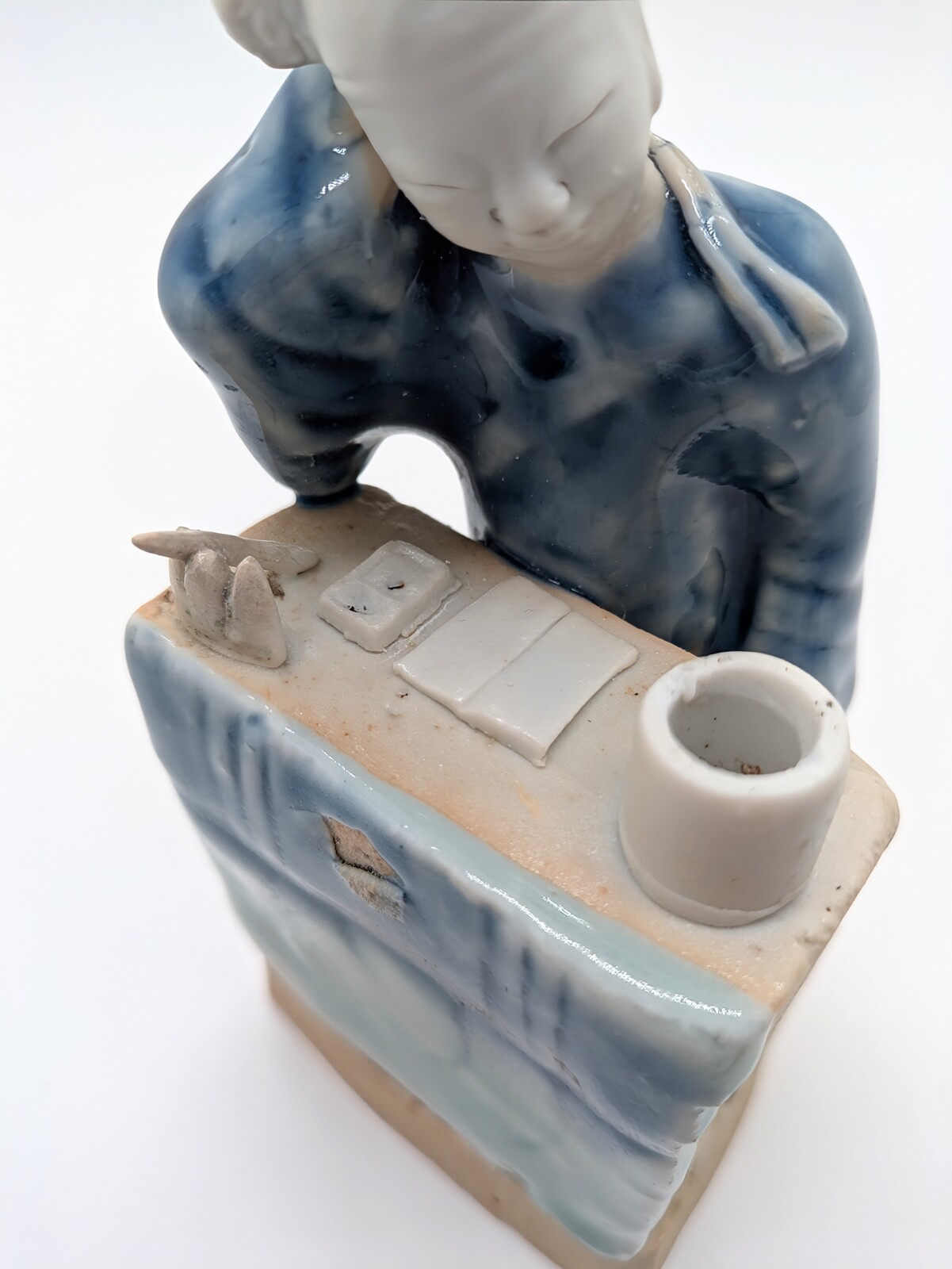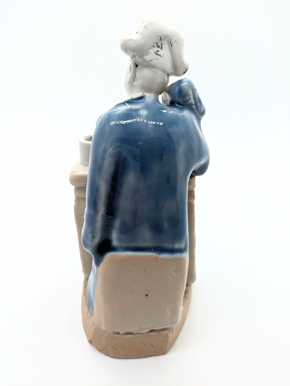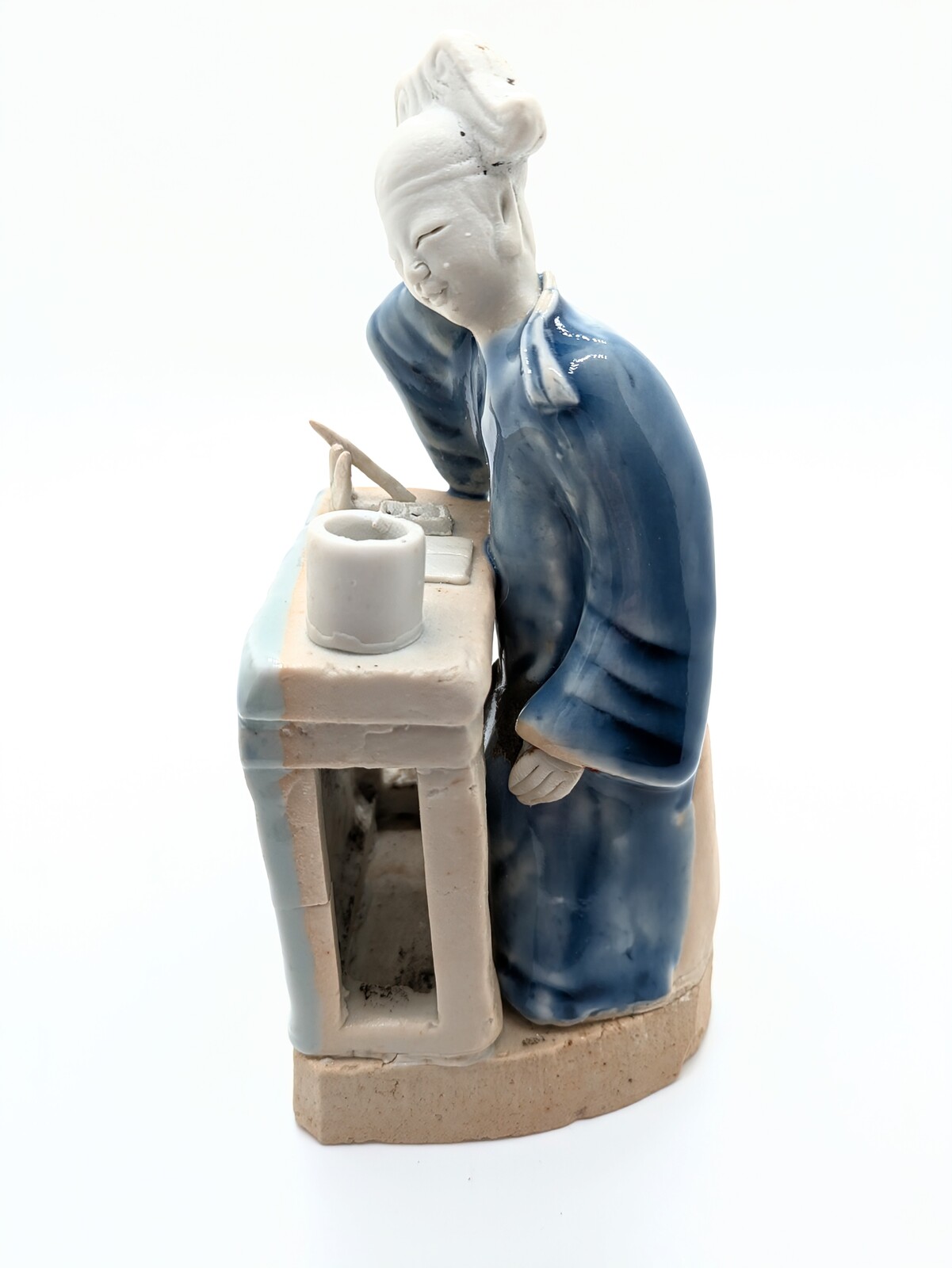 The figure is seated before his desk, he is clad in a blue robe and is wearing a scholar's cap, a ribbon hanging down from his left shoulder. His head is resting on his right arm, his face has a faint smile with half closed eyes as if he is contemplating and trying to find inspiration. On the desk are a brushpot, paper, an inkstone and a brushrest and brush, all left in the bicuit. A cloth frontal glazed in blue and celadon suspends around the front of the desk, leaving the open sides and top in the biscuit, all on an unglazed base.