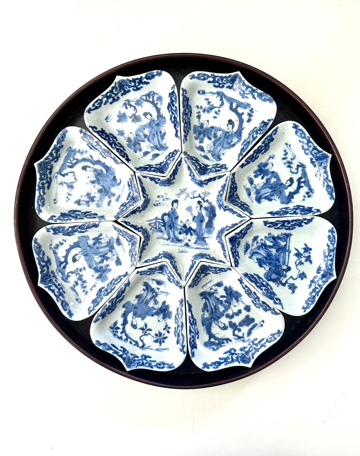 It is interesting to notice that such sets may have been inspired by the small Japanese dishes used in Japan for the tea ceremony and its associated meal, 'kaiseki', and which were exported to Europe around 1670 .