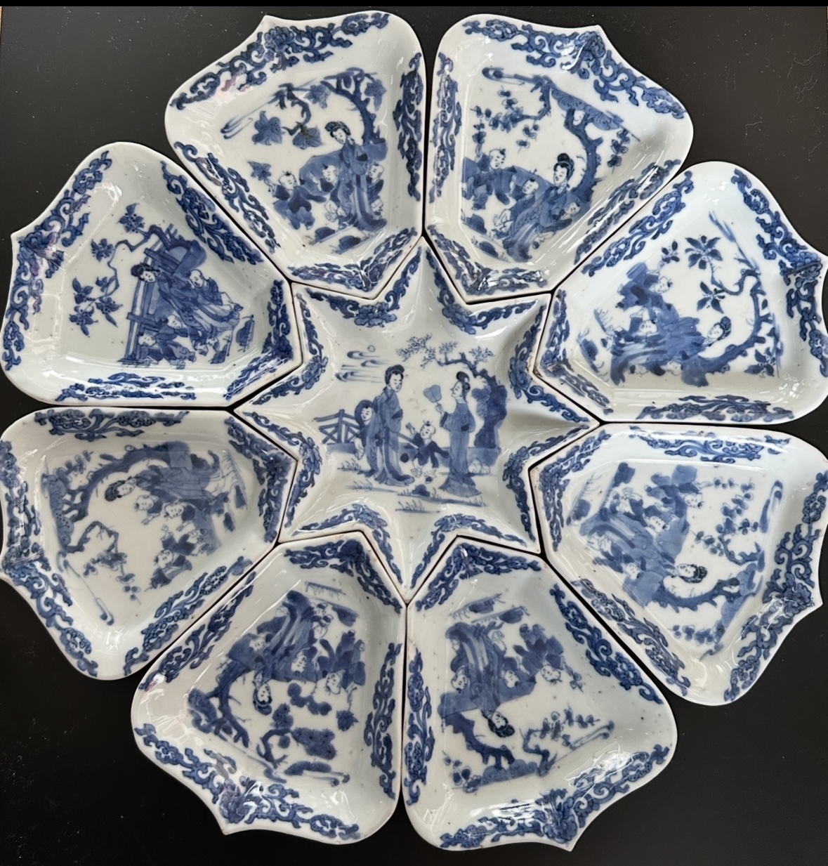 The set consists of a central star-shaped dish surrounded by eight lappet-shaped dishes, together forming a large flowerhead.