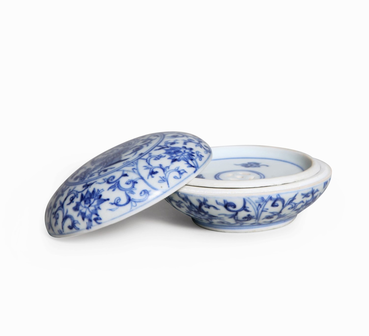The box is of circular form, supported on a short tapering foot. The exterior of the box is painted in underglaze blue in penciled style with lotus heads amongst scrolling foliage. The domed cover is decorated with a repeated design, below a central roundel enclosing a single phoenix. The interior is glazed and contains a liner pierced with a central cash motif and painted in underglaze blue with two flower sprays. The base is inscribed with an apocryphal six-character mark of Xuande.