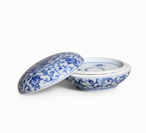 This finely painted box, which has the shape of a seal paste box made for the scholar’s table, is one of a large group of covered boxes excavated from the ‘Chinese Junk’ discovered by Captain Michael Hatcher. Amongst them are many different shapes, sizes and decorative subjects, but only a few contain pierced liners (1). These liners are not found outside the shipwreck (2), making it difficult to determine their original function. It has been suggested that they were used to dispense controlled amounts of rouge (3), which would make the present piece a cosmetic box. Identical liners, found in boxes with straight sides and described as cricket boxes, apparently had a very different function (4).