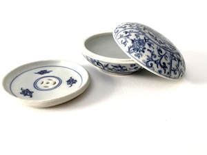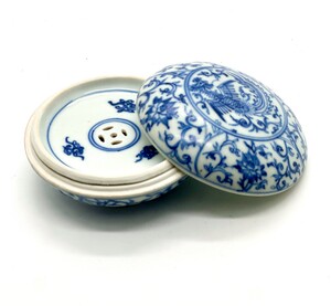特徵:此盒外壁以釉下淡描青花裝飾蓮花紋,盒蓋中央描繪一隻鳳凰。盒內襯碟的中央有鏤空錢幣紋裝飾。底座有「大明宣德年製」偽款。