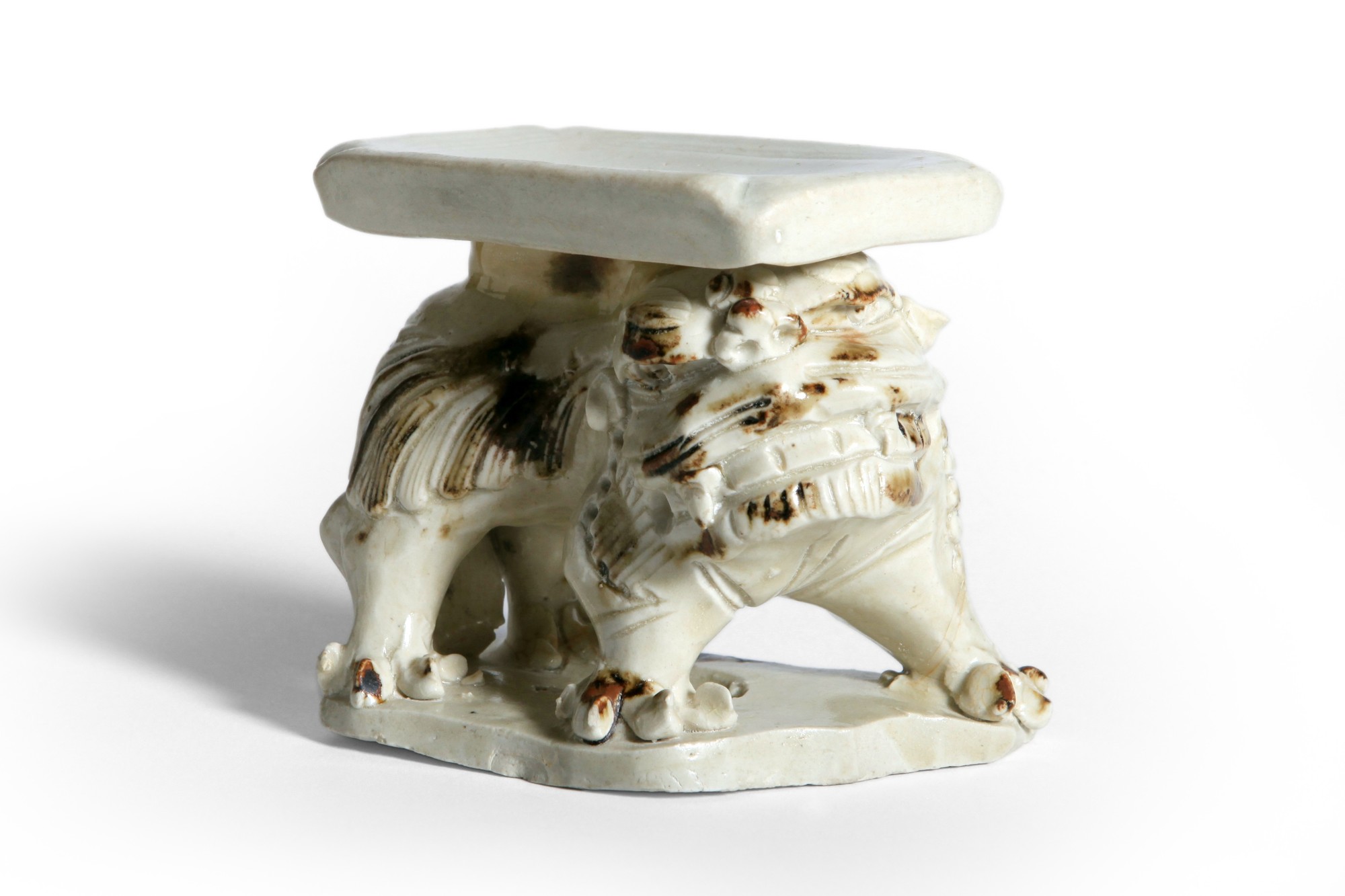 特徵:此枕造型為一頭威武的獅子、站立支撐著表面與底座。獅子通體施透明且帶赤褐色斑紋的奶油色釉。底座與表層呈現灰白色陶器胎體。