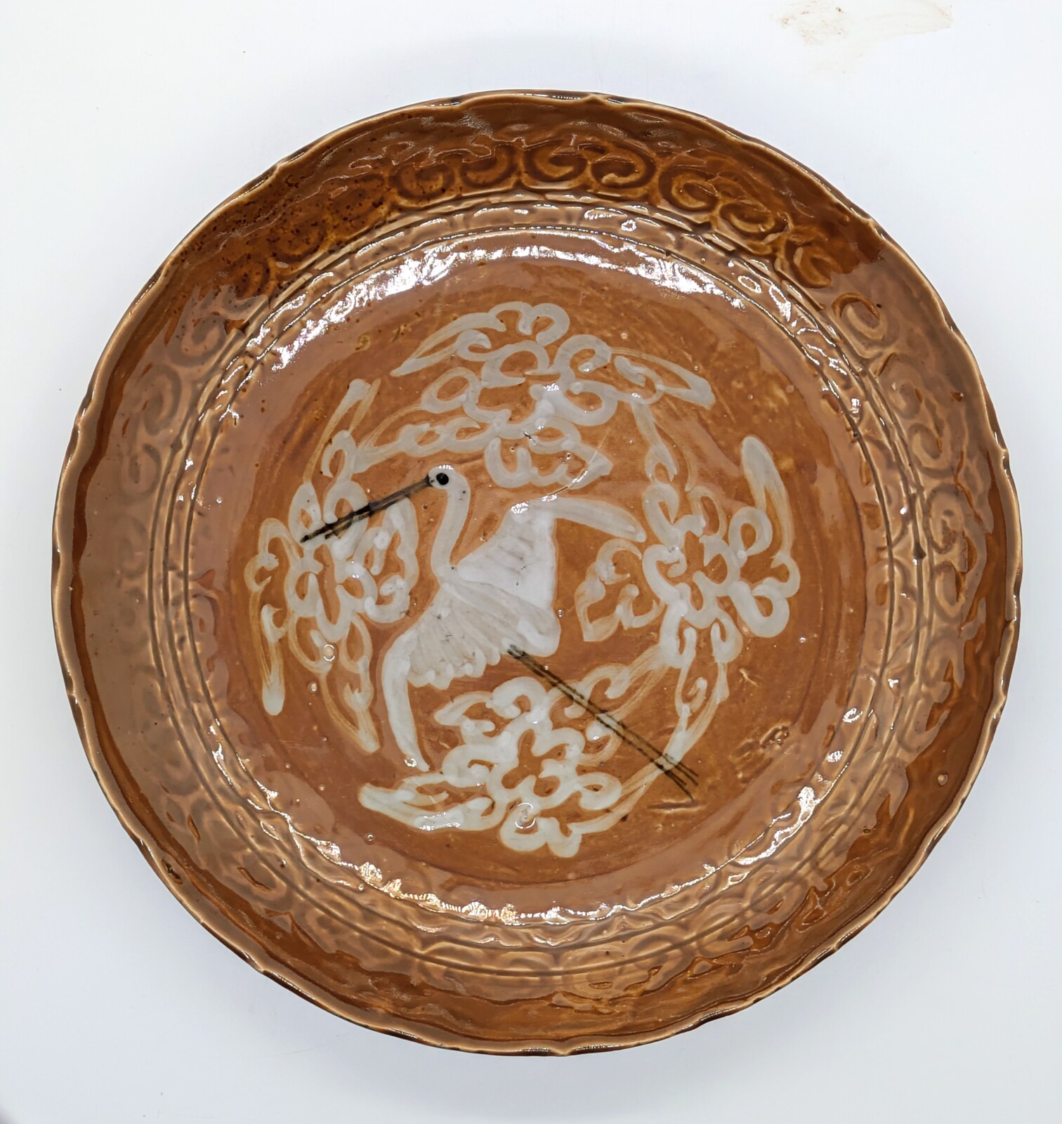 特徵:通體施咖啡棕色釉,盤心描繪在白雲上飛翔的白鶴,盤沿浮雕如意紋。