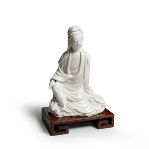 A very similar Guanyin was exhibited at Marchant and illustrated in Blanc de Chine, London, 2006, catalogue. no. 10. Another similar figure is illustrated in John Ayers, Blanc de Chine, Divine Images in Porcelain, New York, 2002, pl. 26. A further example inscribed with a date corresponding to 1629 is illustrated in Donnelly, Blanc de Chine, London 1969, pl. 71B.