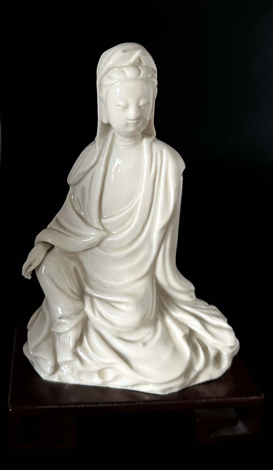 The goddess is seated on a rockwork base with the right hand resting on her raised knee, the left hand concealed below the long flowing robes extending to a cowl. The figure is covered in a creamy-white glaze.
