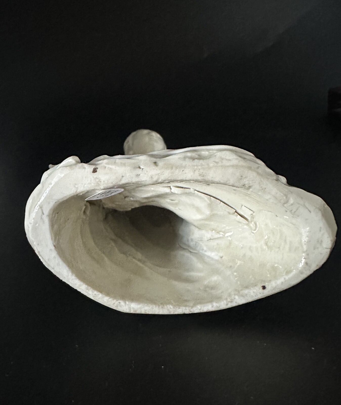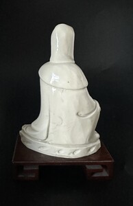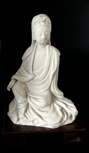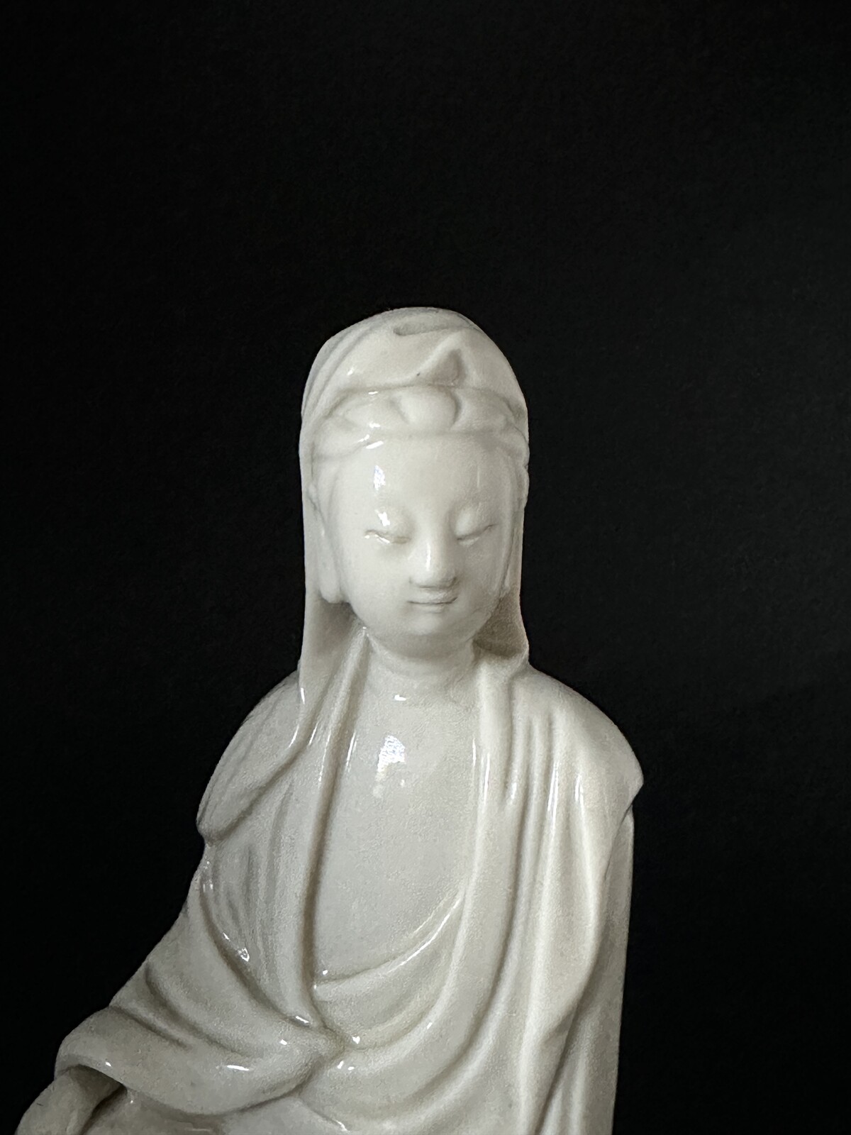 特徵:此像刻畫身著長袍的觀音坐於岩石上。通體施奶白色釉。