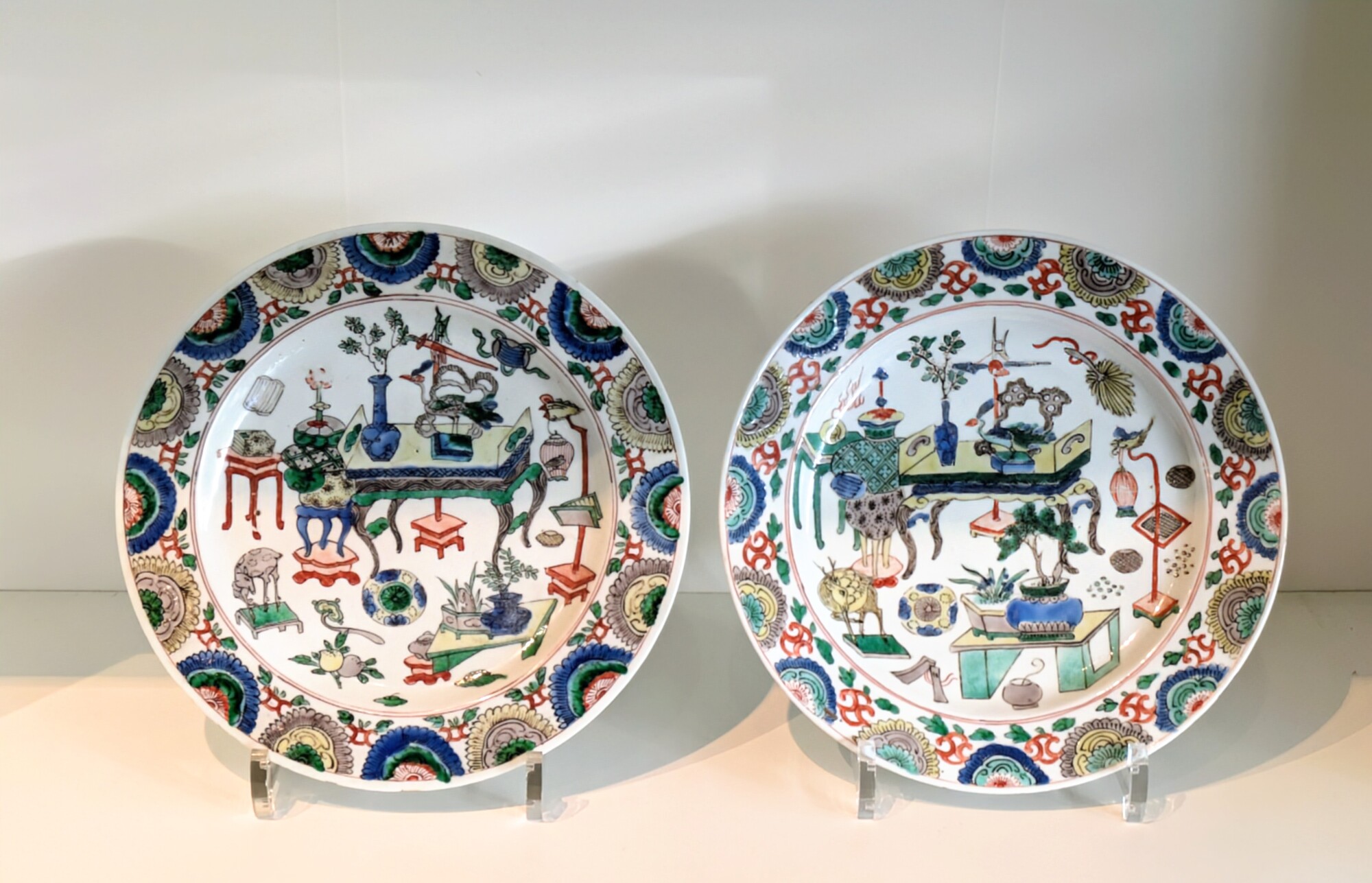 They are painted in bright colours with 'The Hundred Antiquities' including an exotic bird on a wooden table, a deer, a stand suspending a birdcage, flower vases, books and many other treasures and symbols. The flat rim is decorated with demi flower heads linked by leafy sprays. The reverse has e lingzhi in underglaze blue within a double ring below six symbols at the rim.