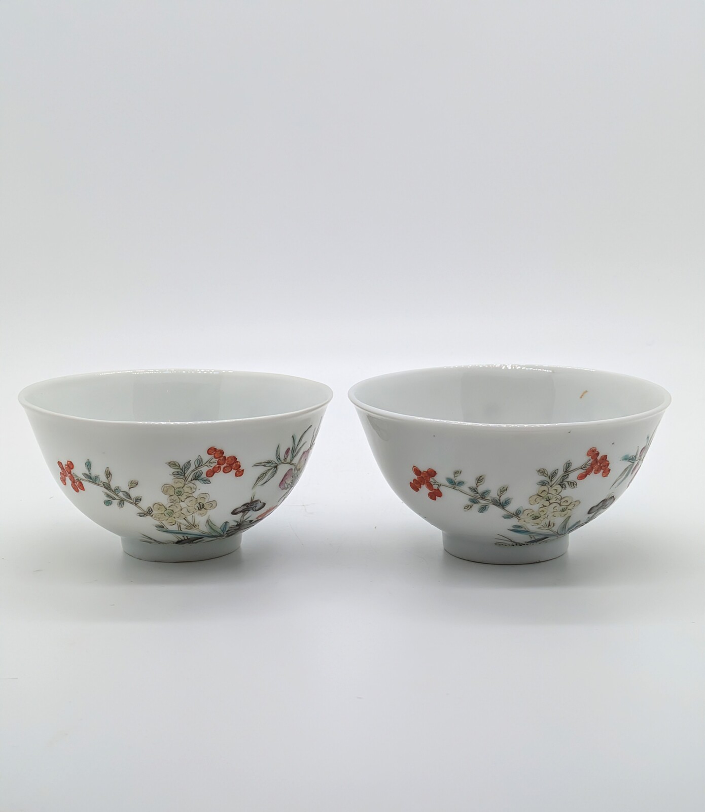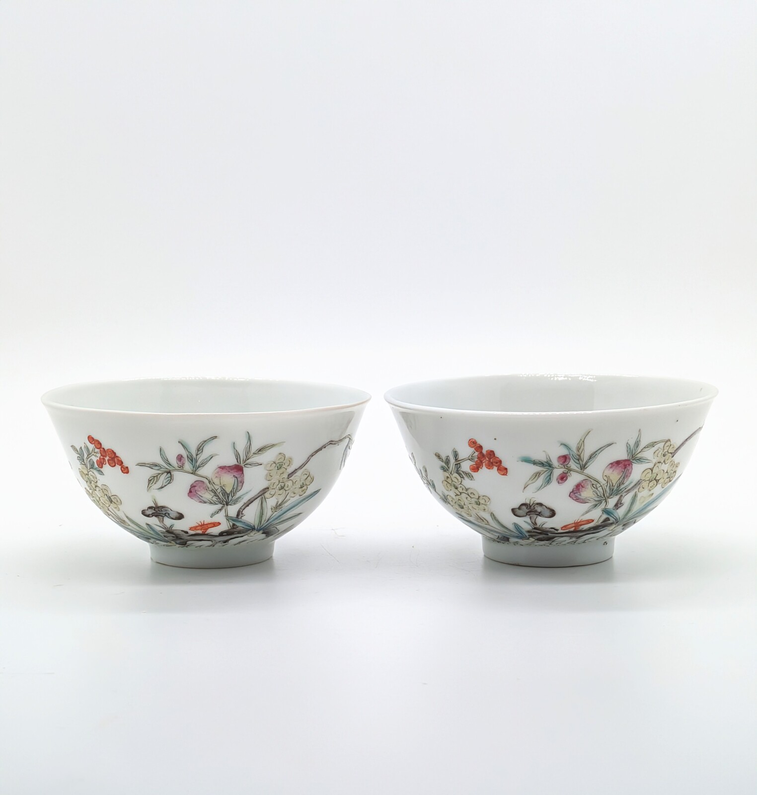 The steeply rounded sides with sligtly everted rim are decorated in bright enamels and black with flowering and fruiting branches and lingzhi growing near rockwork.