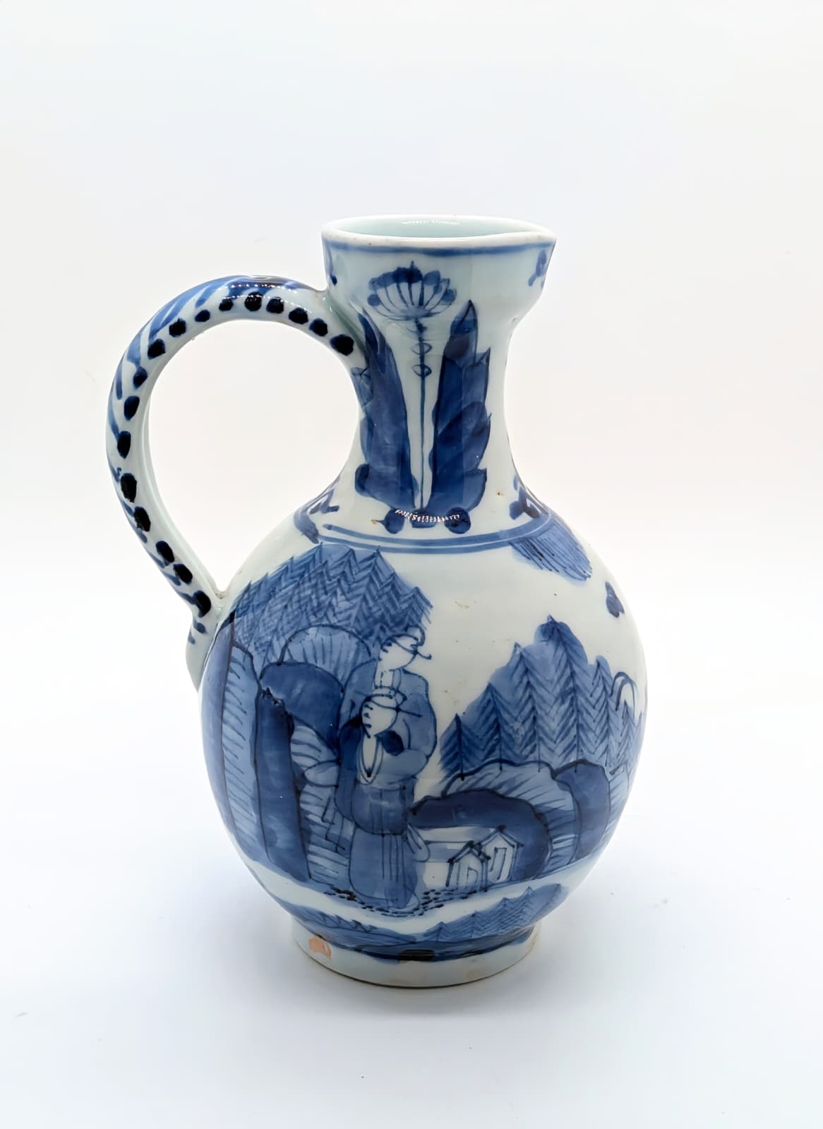 The ewer is painted with a continuous scene of figures in a river landscape, the neck with a stylised tulip on each side.