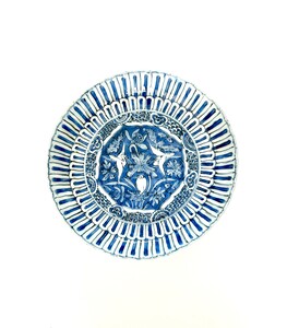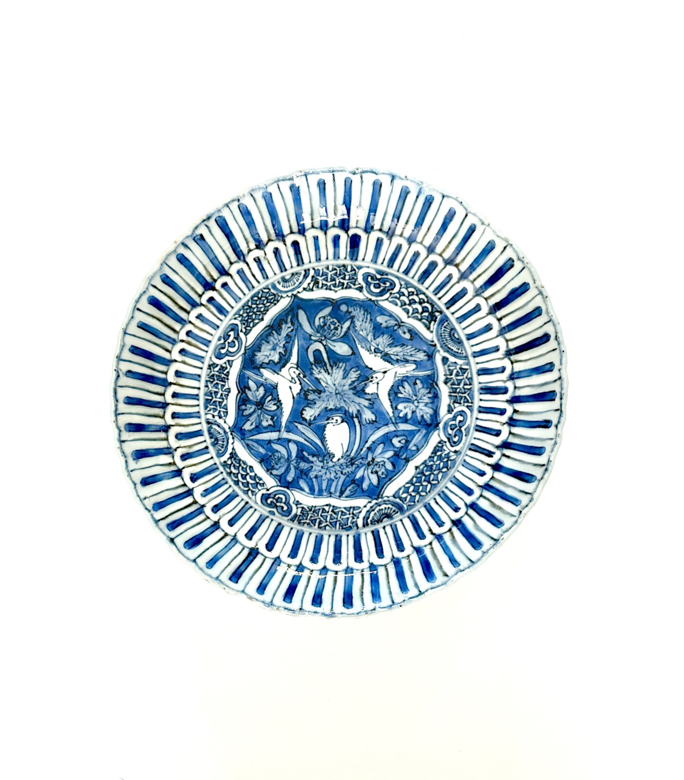 The thinly potted saucer-dish has gently rounded sides moulded with two rows of slightly concave chrysanthemum petals. The centre is painted with a bracket-lobed medallion enclosing a crane perched on a large lotus flower flanked by two further cranes in flight amids bushy leaves. The birds are reserved in white against several shades of blue, all reserved on various diaper patterns divided by Demi-flower heads and ruyi heads. The base is painted with a border of a dotted leaves above the foot.