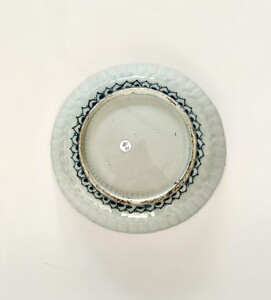 特徵:體薄,盤沿模印兩排略凹之菊瓣形紋飾,花紋內週飾一圈如意錦地紋。盤心菱花開光內一白鶴棲息於蓮上,兩側各有一白鶴展翅飛翔。底足上裝飾一圈點葉紋。