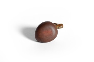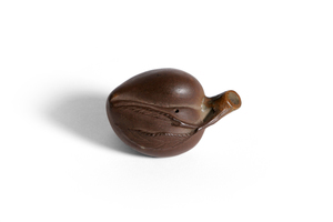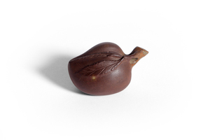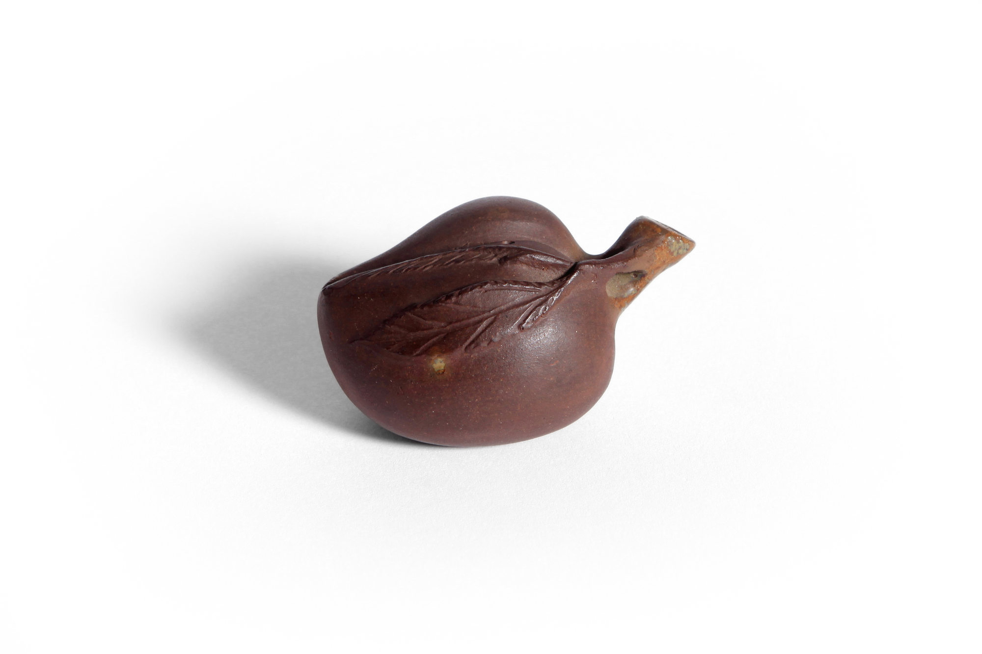 The waterdropper is naturalistically formed as a peach and is moulded with a leafy branch ending into a spout which is partly covered with a transparant glaze. The stoneware is of an even purplish-brown colour.