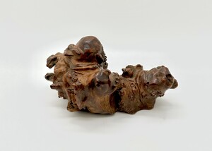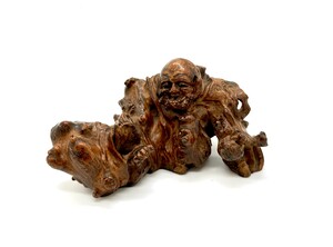 The head and smiling face are well detailed with bushy eyebrows and curly beard. The gnarled wood has a warm shiny patination.