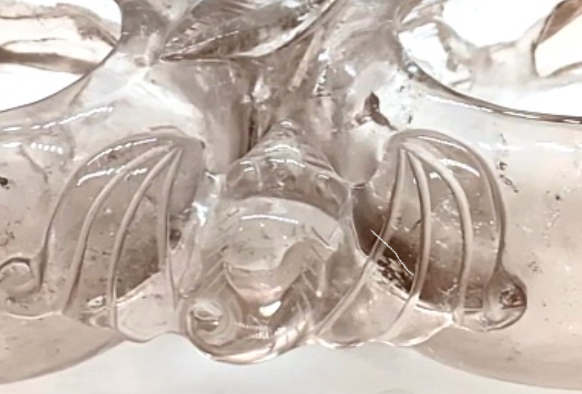 特徵:水晶筆洗琢成雙桃型,頂連枝葉,另琢一隻展翅飛翔於雙桃之間的蝙蝠,寓意「福壽雙全」