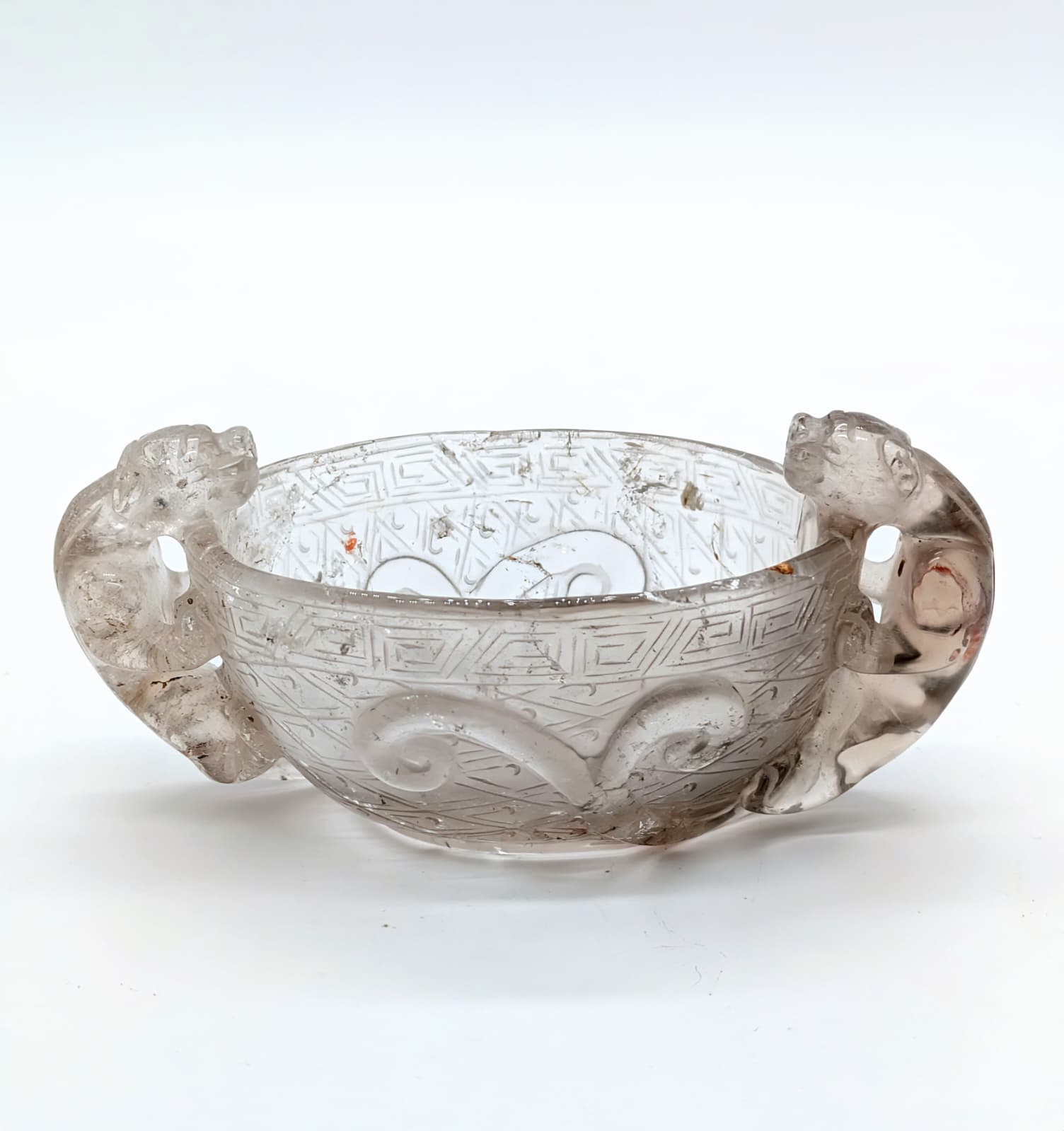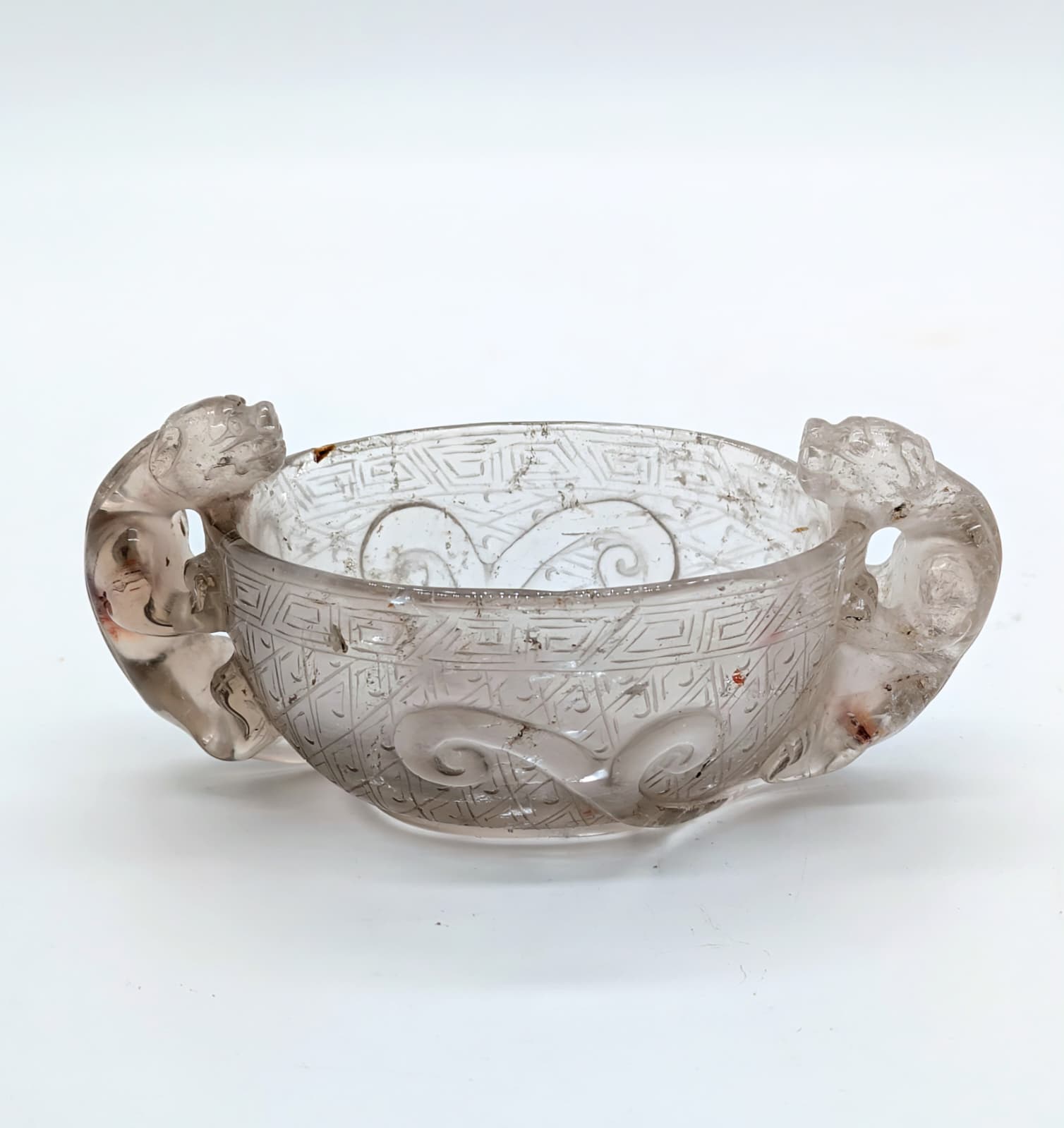 The oval vessel is incised around the sides with a diaper pattern below a meandering border below the rim. It is flanked by two bifid-tailed chilong, carved and pierced in high relief with their long tails extending along the sides.