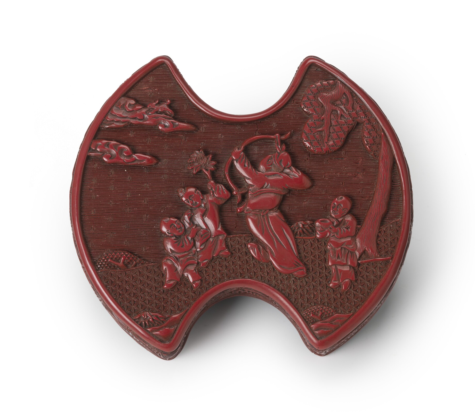 The three-tiered box is of ingot shape with straight sides. The cover is carved with the Immortal Zhang Xian standing in a lively pose, holding a bow and aiming his arrows at a dog gambolling on a cloud. He is accompanied by three boys, two at his left, one holding a branch of osmanthus, while a younger boy clutches his arm. To his right is a third boy standing under a pine tree and holding an alms bowl. The air and earth have different geometric grounds. The sides are carved with bushy leaves within a zigzag border.